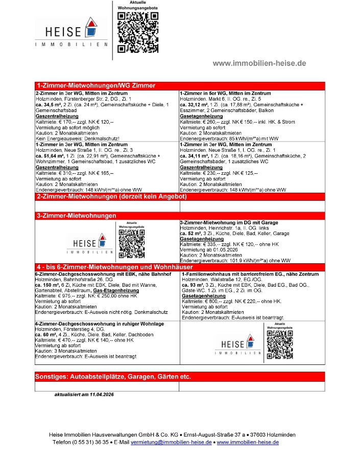 *** UPDATE *** 11.04.2026 *** Aktuelle Mietübersicht *** Heise Immobilien Holzminden